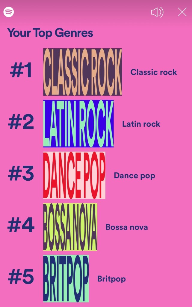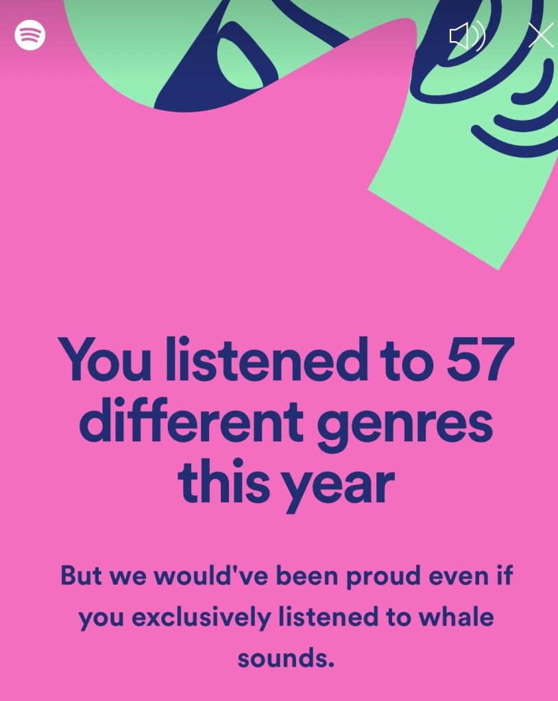 And because we want to end on a fun note, I have here not a “favorite thing” per se but a favorite experience. And that experience is generally the music app Spotify but more specifically their feature called “wrapped,” which analyzes your musical taste for the year and what they say about you.