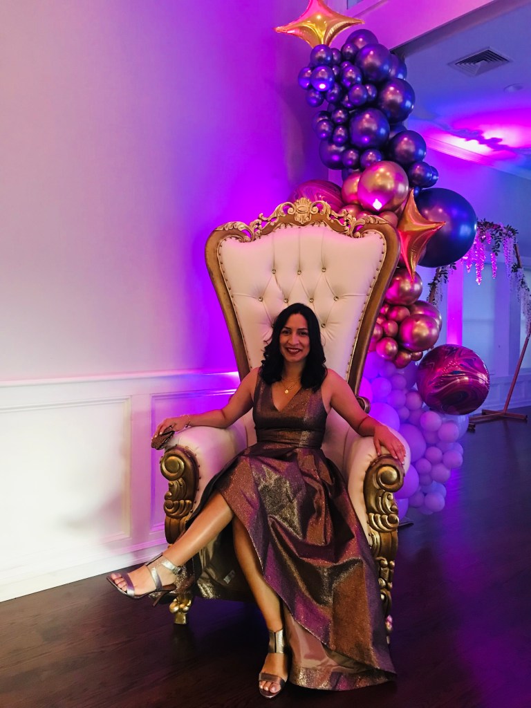 After looking at many ball gowns and dresses, I had found the Calvin Klein metallic dress that glowed with a beautiful copper and gold tone when I first picked it up from the clothing rack at Macys. I cannot emphasize enough how important it is to go dress shopping in person since you want to find the dress that you can easily put on, dance in, and also sit comfortable in, because you don’t want the dress to become nuisance during a big celebration. As you can see from my throne picture right above, I sat and posed with much ease with this dress. And I danced to the Cumbia and música norteña with agility and, might I add, great rhythm.