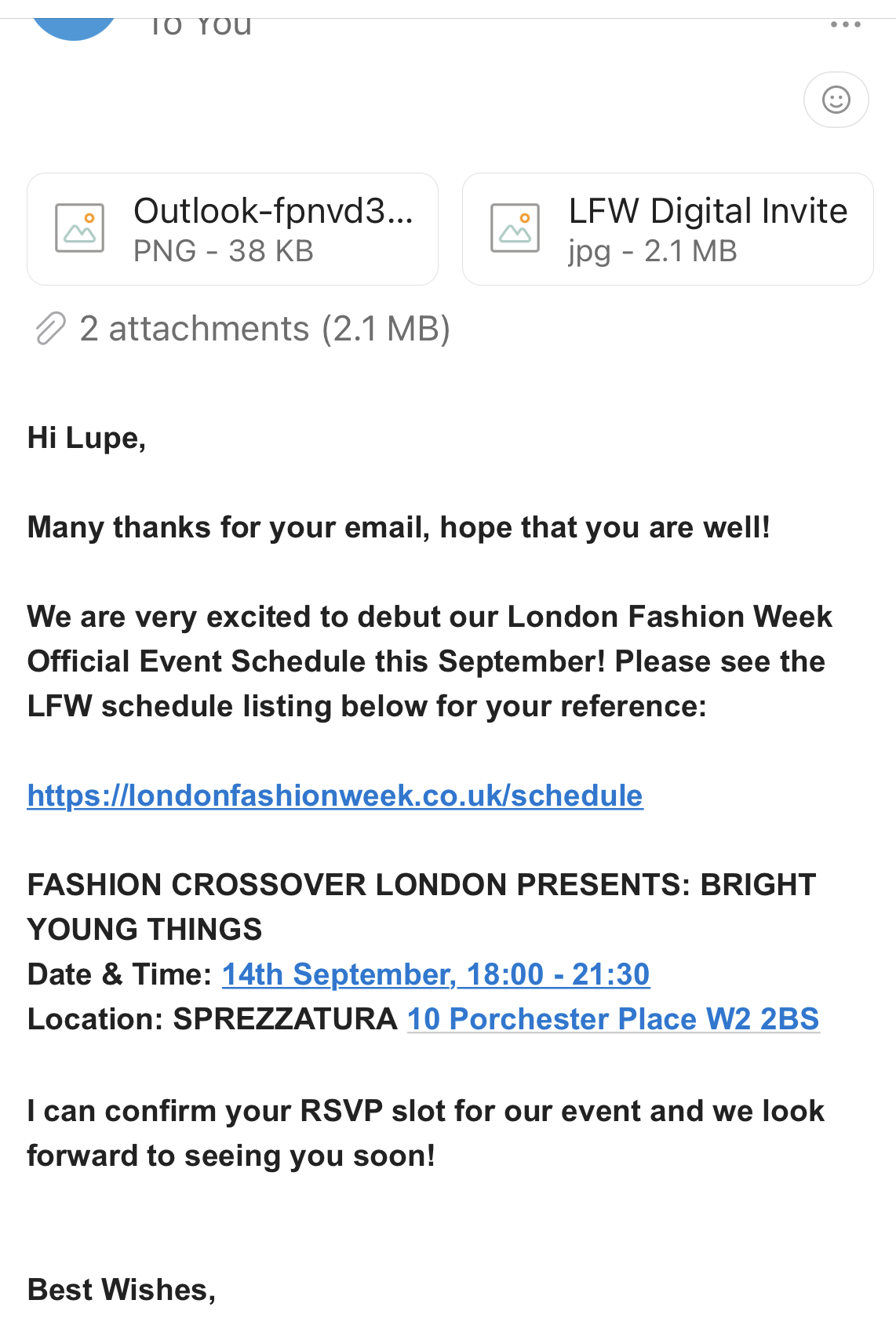 With any problem I face, I always start by doing research. I quickly found out that getting into New York Fashion Week in less than a month would be too difficult. But, not all hope was lost when I came across a YouTube video from a London-based Fashion Vlogger who explained how she was able to get into London Fashion Week (LFW) simply by asking for tickets. How does it work? The London Fashion Week website provides a PDF schedule for the entire week that lists all the fashion shows and events–some of those shows are categorized as “INVITE only,” while others are categorized as “RSVP.” The RSVP shows provide an email address of the brand’s publicist or publicity firm. I counted 31 RSVP shows for the 2023 Fall London Fashion Week (which is a lot) and then I proceeded to email all 31 brands to ask for tickets.