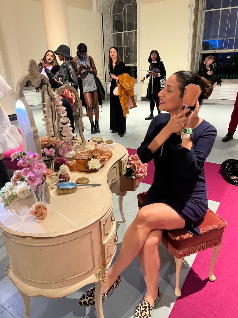 However, this newfound confidence was tested when later that evening I attended what was probably the most lavish fashion show of the week—the SABIRAH collection at the iconic Somerset House near the River Thames. This beautiful Art Gallery once served as the home for the Queen of England in the 17th century. The runway was a pink carpet that encircled an antique vanity table and mirror, with a grand harp positioned in the center of the room. As soon as the harpist began playing classical music, the models emerged adorned in luxurious satin gowns and structured coats. Standing in front of the runway, I was only a few inches away from them and could discern the high quality of the garments, which is what this brand is known for. Designer Deborah Latouche repurposes unused materials from high-end fashion houses in Italy that are otherwise discarded, using them to create her elevated modest fashion pieces. Although my insecurities briefly surfaced upon witnessing this exclusive show, I ultimately chose to embrace the Victorian fairytale vibes that surrounded me.