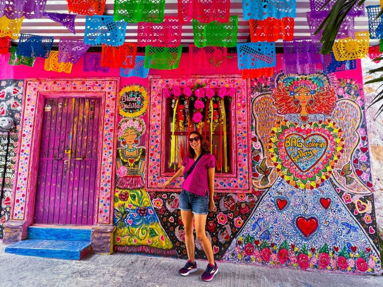 After breakfast, I recommend you just walk across the street and check out the artisanal market where you can buy everything from jewelry, leather handbags, interior home decor, lanterns and traditional Mexican clothing. If you walk along the street for a few blocks you will come across a colorful portion of the street where you are suddenly enveloped by bright pinks and the traditional Mexican Papier–mâché called “papel picado.” As someone who loves to wear pink, I was in critical chica color heaven!