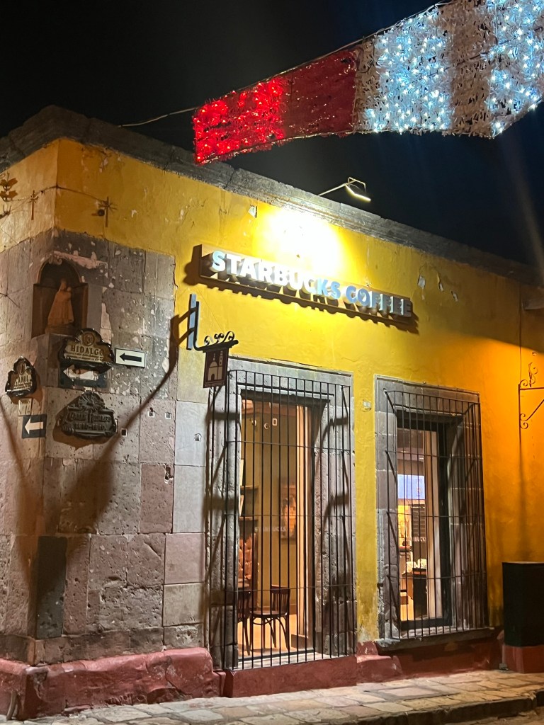 Decades later, and generations later, now we see an almost reverse migratory pattern where Americans are flocking to towns like San Miguel de Allende and Puerto Vallarta not to labor but to retire and enjoy the good life and the “warmth” of the Mexican people. They are obviously part of the American imagined community but also very much an example of being part of an upwardly-mobile and cosmopolitan international community. And when that community travels they bring along the consumer patterns that they enjoyed in their home country, including the local Starbucks establishment. I couldn’t help but snap the picture below of one of the nicest and most quaint Starbucks I’ve ever seen, housed in the corner of what was clearly a 16th-17th century colonial structure nearby the town square. There I saw the familiar and now global Starbucks branding right next to what were the remaining decorations of the Mexican Independence festivities.