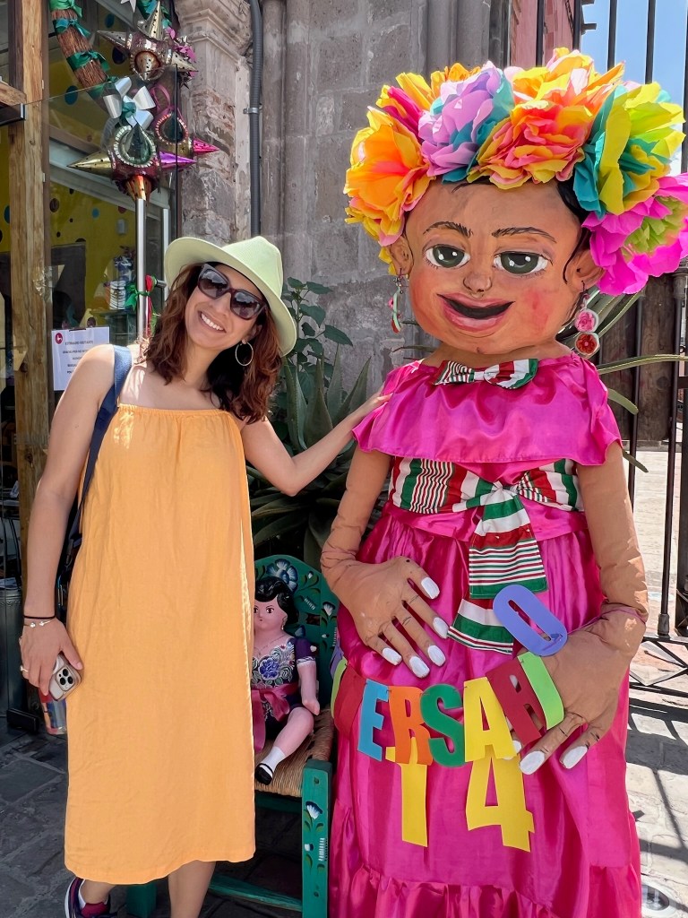 Apart from the architecture and art scene, you will also come across another iconic cultural staple of this town: the Mojigangas. Below, I took a picture with a miniature size papier-mâché doll because the authentic Mojigangas can actually be quite tall–they stand as tall as 6ft to 18ft feet tall! They are held up by individual performers on stilts and are present during city celebrations or weddings. If you go to the center plaza in front of the church, you’ll be sure to run into them.